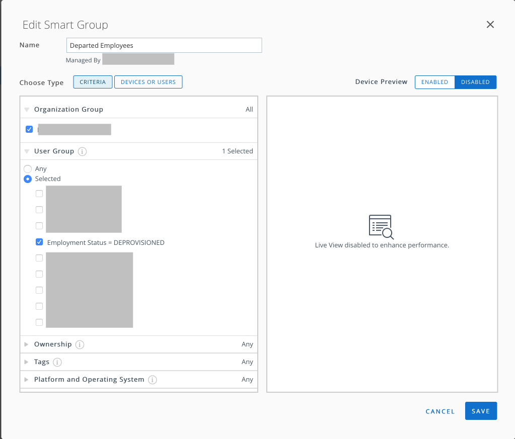 It’s important to identify devices that are owned by previous employees and take action on them, either removing or quarantining them so that they don’t continue to have access to company resources. I you have Okta’s LDAP configured in Airwatch you can do this via a User Group and some custom filters in the devices list.