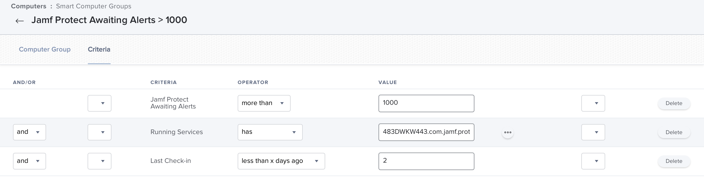 This will create a group that shows us which computers haven’t completed a Jamf Protect check-in during the last 5 days but have completed a Jamf Pro inventory update in the last two and they also have the 483DWKW443.com.jamf.protect.security-extension service running.