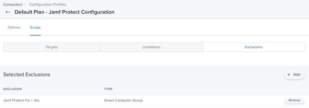 For the Reinstall process to work you’ll need to add the “Jamf Protect Fix = Yes” group as an exclusion to all of your Jamf Protect Configuration profiles. This way when the Jamf Protect Fix Policy above runs the config profile is removed and re-pushed to the computer. This will trigger a reinstall.